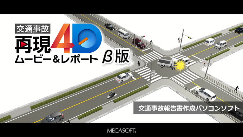 「交通事故再現4Dムービー&レポート β版」は、メガソフトが開発中の交通事故報告書作成を主目的とした3DCGソフトのβ版(開発途中版)です。
