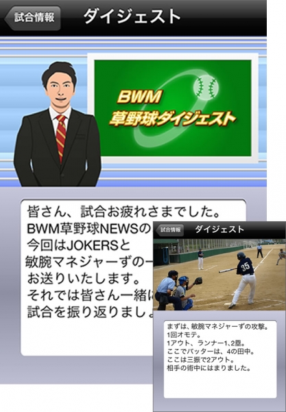 また、見所を自動編集して野球ニュース風に仕上げる「BWM草野球ダイジェスト」も作成できます。