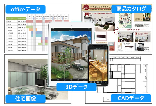 イエクラウドは、建築3Dモデルの他、CAD図面、写真、見積書、カタログなどのPDF書類のような、建築の打ち合わせに必要な各種資料を表示・共有できるクラウドサービスです。