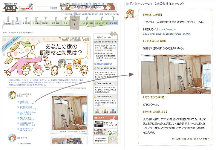 ▲2016年9月公開記事「あなたの家の断熱材と効果は?」では、断熱材の種類、選んだ理由、そのほかの候補、実際に住んでいるからこそわかる効果をアンケート。一部施工中の写真も添えられたマニアックな回答が集まりました。