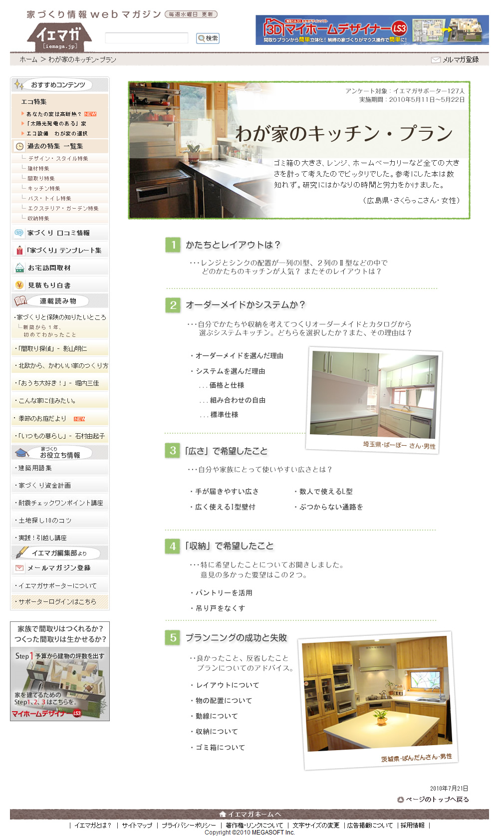 パソコン用住宅デザインソフト「3Dマイホームデザイナー」を開発・販売しているメガソフト株式会社が運営しているWebマガジン。住まいに関する情報提供を行うだけでなく、読者がそれぞれの住まいや暮らし方について考えたり、話題について意見を述べたりすることで情報交換を行える、読者参加型のWebマガジンです。