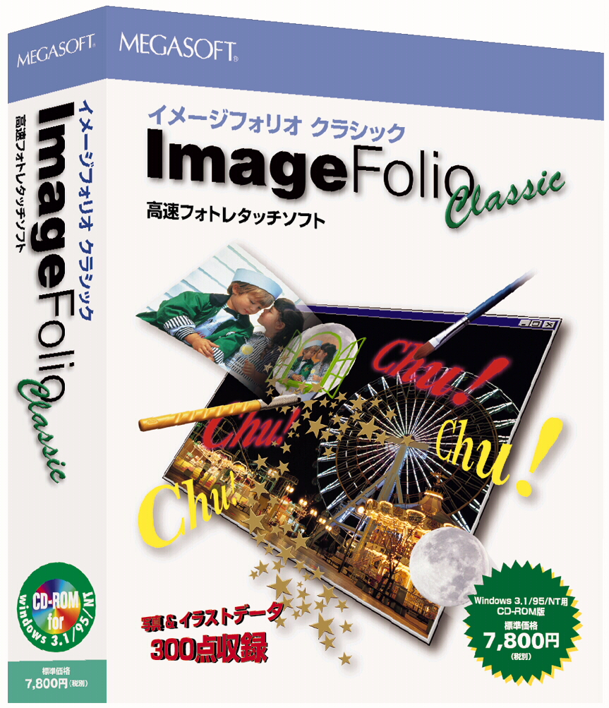 メガソフト株式会社では、来たる5月下旬、 高機能フォトレタッチ「ImageFolio 97」の発売と同時にこれまで販売していた 「ImageFolio Ver.3.0J」の廉価版「ImageFolio Classic(イメージフォリオ クラシック)」を発売します。 これは、「ImageFolio Ver.3.0J」をリニュアールしたもので、16ビットアプリ ケーションにも関わらず、独自のアルゴリズムにより、高速化を実現しており、 Windows 3.1ユーザーの方はもちろん、Windows 95、Windows NTユーザーの方 にもフォトレタッチの入門として最適なソフトとなっています。 また、レタッチに必要な美しいイメージファイルを300点収録しています。