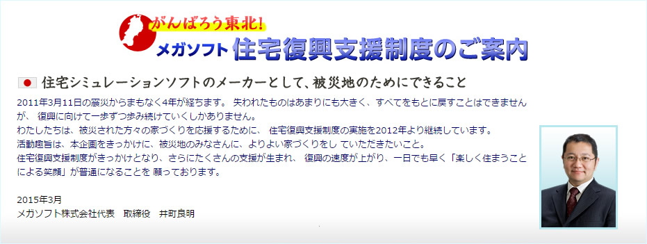 メガソフト株式会社(所在地:大阪府大阪市、代表取締役:井町良明)は、2012年2月より実施している東日本大震災住宅復興支援制度を継続して実施してまいります。