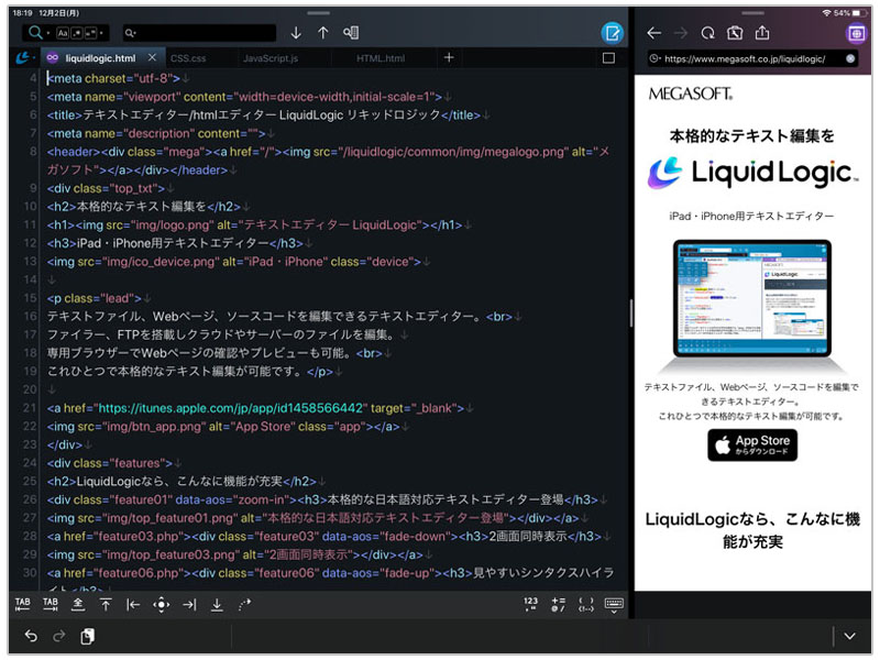 メガソフト株式会社(本社:大阪市/代表取締役:井町良明)は、ファイラー、FTP、ブラウザーを搭載したiPad・iPhone用テキストエディタの最新バージョン「LiquidLogic 1.1.0」を2019年12月9日に公開しました。