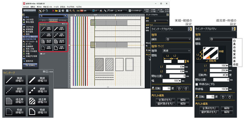 実線・破線、導流帯、枠線も描画でき、ラインテープの太さやハッチングの感覚なども指定可能です。