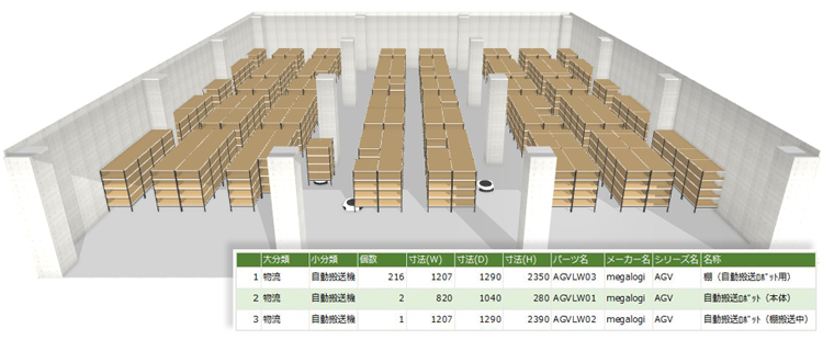 また、レイアウトに伴う配置したラックや機器類の数をカウントする機能や、倉庫管理システム(WMS)のデータとの連携機能なども搭載しています。