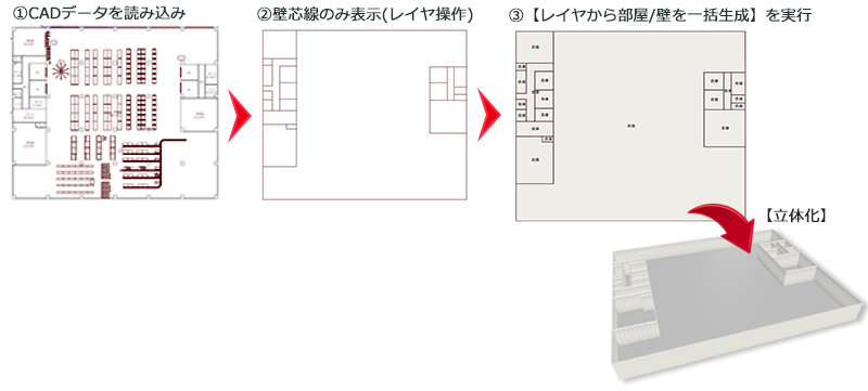 【レイヤから部屋/壁を一括生成】、【閉じている線から部屋生成】の2機能を搭載。例えば、特定のレイヤに描かれた線分(壁芯線)を指定すると、一括で部屋や壁を自動生成します。