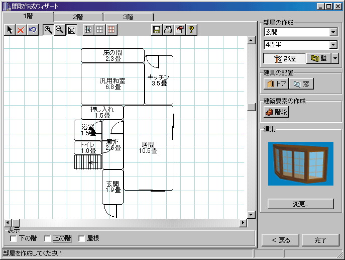 部屋の種類を選び、マウス操作で広さや配置を決めれば、ボタンひとつで高さや奥行き情報を自動生成し、住宅を3D化するという画期的な機能です。