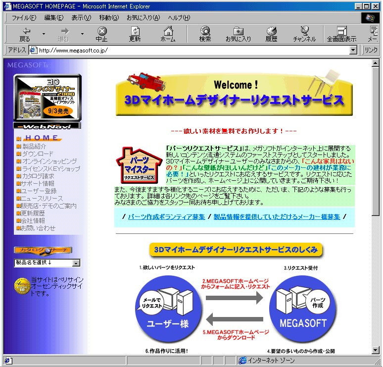 メガソフト株式会社では、3D住宅デザインソフト「3Dマイホームデザイナーシリーズ」の新しいサービスとして、「パーツマイスター制度」の第一弾、「パーツリクエストサービス」をホームページ上で、1999年4月30日から開始いたしました。