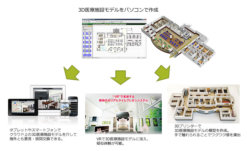 「3D医療施設モデル」は実機を設置したショウルームとは異なり、いつでもどこでもプレゼンテーションが可能で、顧客のニーズにあわせてレイアウトの修正や機器の入れ替えが容易な点が一番のメリットです。また、メールやクラウドサービスを経由して離れた場所にいる担当者とのコミュニケーションができる点も国際展開における役割は大きいとMEJは考えています。さらに3DCGデータはバーチャルリアリティ(VR)や3Dプリンターへの展開も可能で、疑似体験による印象づけも期待できます。