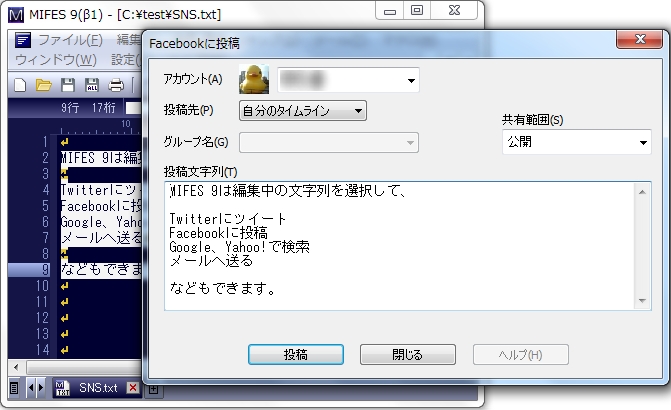 MIFESで編集中の文字列をFacebookに投稿する機能です。