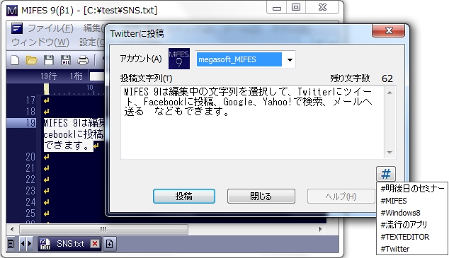 メガソフト株式会社は操作画面からワンタッチでTwitterやFacebookに投稿できる、テキストエディタソフト「MIFES 9」(マイフェスナイン)の最新バージョン(Ver.9.1)の公開テスト版(パブリックベータ版)を、2012年10月30日より無償で配布開始いたします。