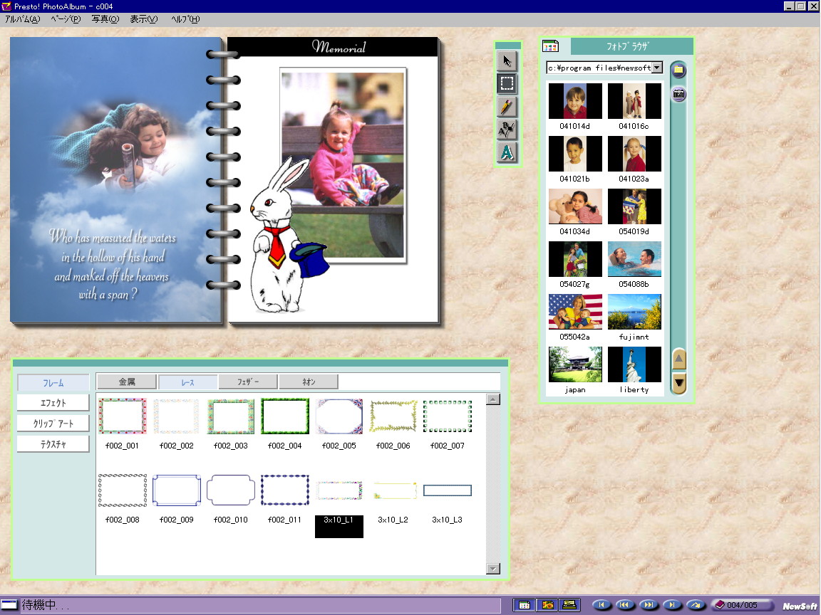 フォトアルバムは、パソコンのアルバムソフトにありがちな、ただ画像ファイルを並べるだけ、といった味気ないものとは違います。写真フレームは、ハート型やネオン、額縁などを用意していますし、写真や文字を好きな位置に好きな角度でレイアウトできるから、紙のアルバムそのままの自由度で、永久保存ができるのです。