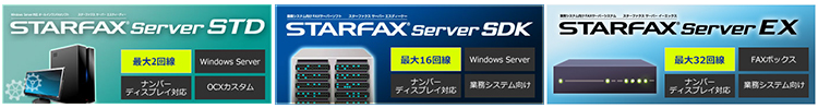 ■STARFAX Server STD(最大2回線まで対応) https://www.megasoft.co.jp/starfaxserverstd/ ■STARFAX Server SDK(最大16回線まで対応) https://www.megasoft.co.jp/starfaxsdk/ ■STARFAX Server EX(最大32回線まで対応) https://www.megasoft.co.jp/starfaxserverex/ |
