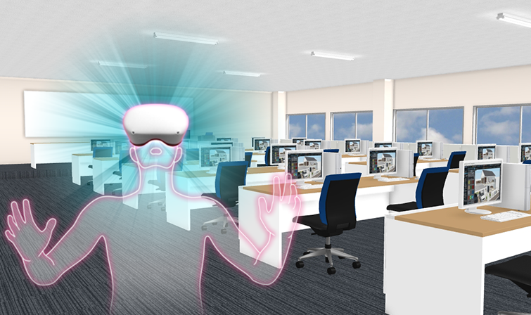 この度新発売した「メガソフトVRソリューション アカデミックエディション」は、メガソフトの建築デザインソフトで作成した3Dデータをヘッドマウントディスプレイ(VRゴーグル)を装着することで実寸体験ができる学校・教育機関向け製品です。