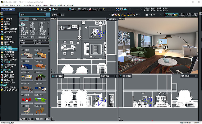 壁・床・天井・外装・外構のテクスチャ設定/ニッチ・トリム/背景設定/設備機器・家具・小物・照明器具・カーテン類の配置と移動/リアルタイムレンダリング
