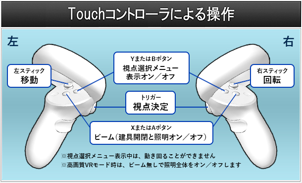 @ハンドコントローラーのボタンの押下で「視点選択メニュー」を表示し、Aジョイスティックで視点を選択、Bトリガーで視点決定すると視点移動が可能、「視点選択メニュー」にはサムネイル画像と登録した視点名も表示されるため、目的の部屋やシーンを迷わず選ぶことができます。