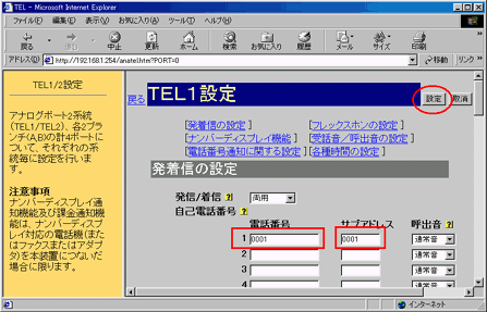 ![]() アナログポートTEL1の着信番号の設定を行ないます。