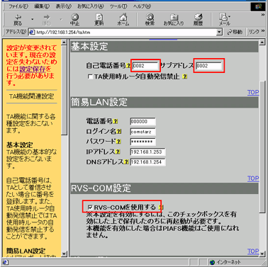 [管理者(設定)]-[TA機能関連設定]ページを開きます。RVS-COMへ着信させる回線番号の設定を行ないます。 「着信設定」 「RVS-COM設定」 「設定」ボタンをクリックします。