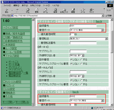 「ダイヤルイン登録番号0」 「ダイヤルイン登録番号1」 「設定」ボタンをクリックします。
