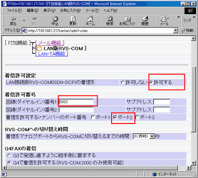 「着信許可設定」 [LAN接続版RVS-COMの着信] →「許可する」にチェック [着信許可番号] →「回線番号1」に追加回線番号 を入力 [着信を許可するi・ナンバーの ポート番号] →「ポート2」にチェック