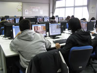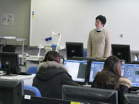参観させていただいたのは岩村教授ご担当の1年生のインテリアコーディネートの授業。今回の課題は指定の間取りを使ってキッチン、リビング、和室などの各部屋をインテリアデザインするというもの。学生たちはコンピュータ室で3Dマイホームデザイナーを使いこなしながら熱心に課題に取り組んでいます。しかし決して堅苦しい雰囲気はなく、どちらかと言えば「和気藹々」。学生同士で情報交換をしながら楽しそうにデザインをしていました。