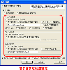 設定は簡単、転送したいメールアドレス(複数アドレスも可)を入力したり、印刷したいプリンタを選択するだけ。