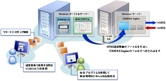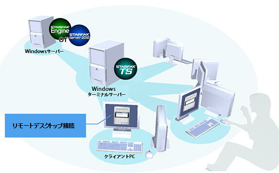 Windows Server のターミナル サービス(リモートデスクトップ サービス)に対応した専用FAXクライアントです。 クライアント毎にSTARFAXをインストールすることなくFAXの送受信ができ、更新作業などで一元管理が行え、管理コストを大幅に削減することができます。 ユーザーは、クライアントPCからリモートデスクトップでサーバーに接続し、STARFAXを利用します。
