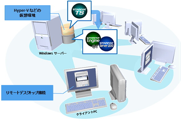サーバー仮想化(Hyper-VやVMwareなど)を利用し、STARFAX Server SDKまたはSTARFAX Server 2010をホストOSに、STARFAX TSをゲストOSにインストールすることにより、サーバーの統合ができます。 STARFAX TSは仮想環境にインストールしてご利用いただけます。(ネットワークが必須)