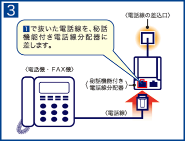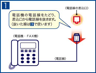 図の「電話線の差込口」は電話機やFAX機につながっている電話線が差し込まれている場所をあらわしています。 差込口はお客様によりちがいますので、イメージ図であらわしていますが、実際はインターネット機器、電話機器、壁の差込口になります。