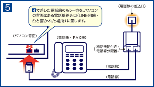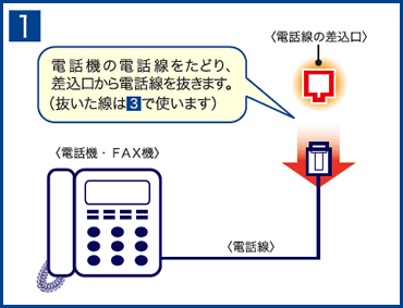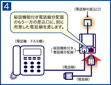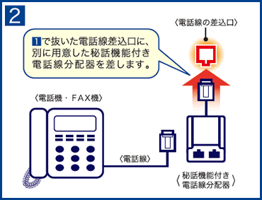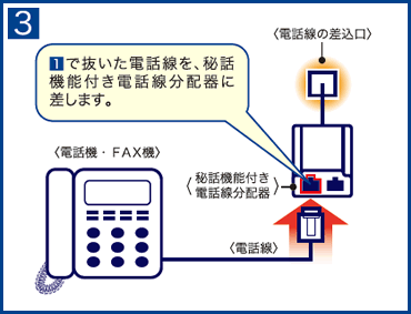 接続に別途必要なもの:電話線、秘話機能付き電話線分配器図の「電話線の差込口」は電話機やFAX機につながっている電話線が差し込まれている場所をあらわしています。差込口はお客様によりちがいますので、イメージ図であらわしていますが、実際はインターネット機器、電話機器、壁の差込口になります。