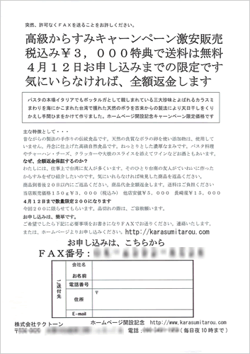 「突然、許可なくFAXを送ることをお許しください」と苦情を極力減らす配慮の一文がある。