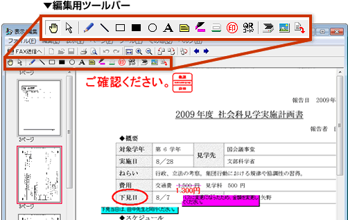 受信FAXに文字を書いたり丸を付けたりして返送する際にも便利です。