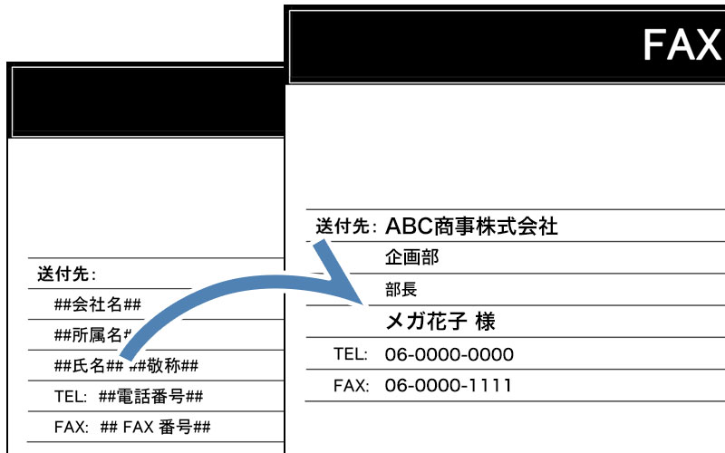 Wordで作成した文書に、特定の文字列を挿入すると、その文字列を、送信先の情報に置き変えて送信することもできるので、オリジナルの送付状も作成できます。