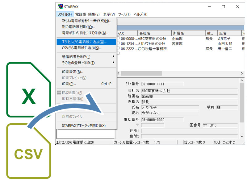 Excel、CSV形式の住所録データを、ダイレクトにSTARFAXの電話帳に取り込み。