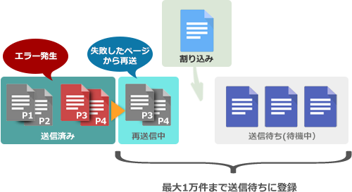 1つの宛先に複数ページの原稿を送信する際に、途中でエラーが発生した場合はエラーが発生したページからFAX送信を再開します。