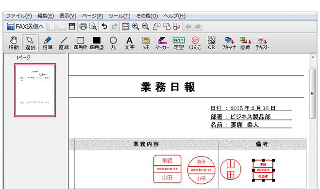 セットしたFAX原稿や、送受信したFAX原稿に、文字をいれたり、ハンコを押したり、○や□などの線を書き加えるたりすることができます。