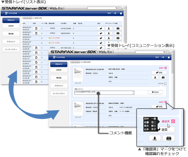 コメント機能を利用して対応状況を確認しあうなど、利用者間でFAX情報を「共有」することができます。
