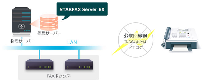 そのため、仮想環境にSTARFAX Server EXをインストールし、同LAN上に設置したFAXボックスから