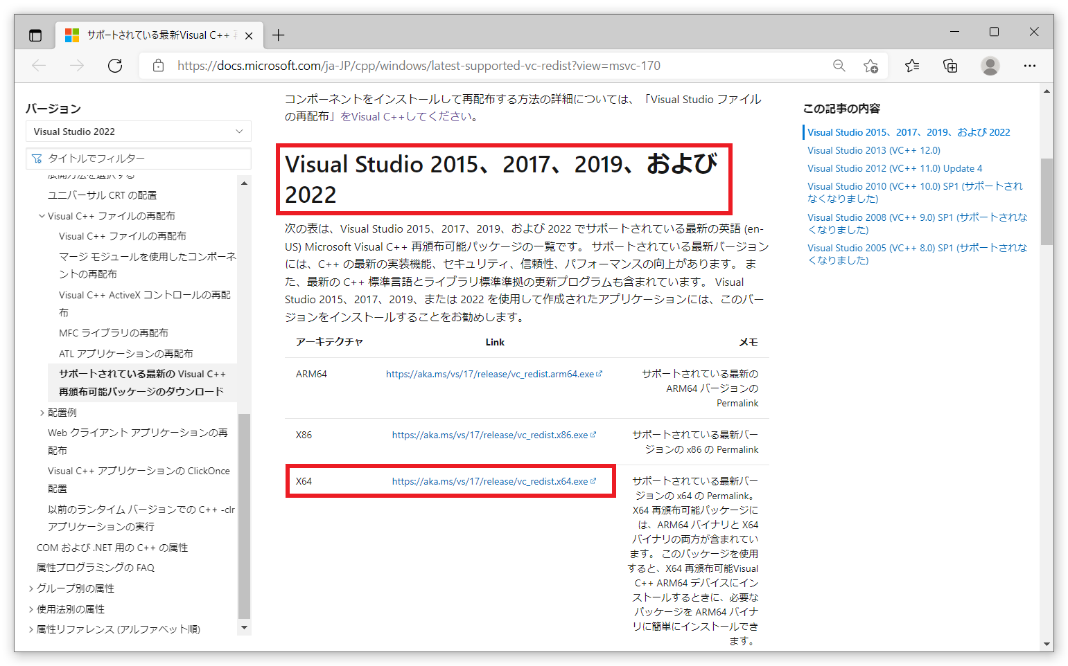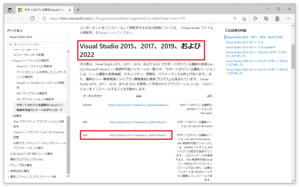 2.「Visual Studio 2015、2017、2019、および 2022」の「https://aka.ms/vs/17/release/vc_redist.x64.exe」をクリックして「vc_redist.x64.exe」ダウンロードし、実行します。