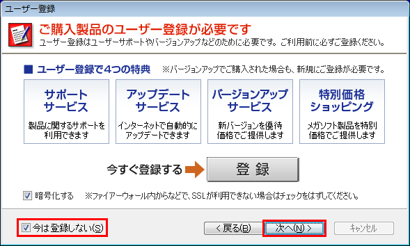 詳細ユーザー登録画面で、ライセンスキー入力後「すでにユーザー登録されたライセンスキーです」と表示されて登録できない。 原因/対処弊社製品のユーザー登録は、所有されている製品につき1回ご登録いただければよいので、2回目のユーザー登録は必要ございません。 ▼セットアップ時に出てくるユーザー登録画面 |