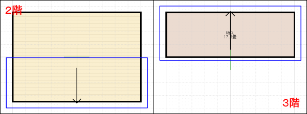 1. フロアタブの[2階]を選択し、2階の間取りで段違いの屋根の上屋根が掛かる部分を確認します。