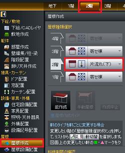 3. 2階の屋根を設定ナビの[屋根作成]を選択し、パレットの[2階]の[屋根種類選択]から[片流れ(下)]を選択します。