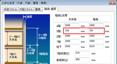 [階高・壁厚]タブに切り替え、3階の「天井高」に「100mm」、「階高」に「101mm」と入力して[OK]をクリックします。