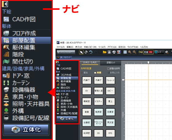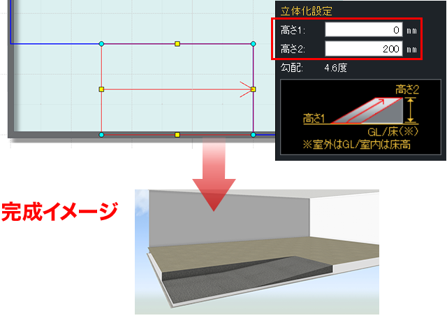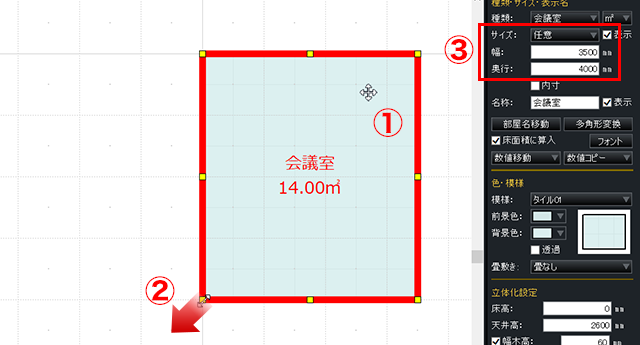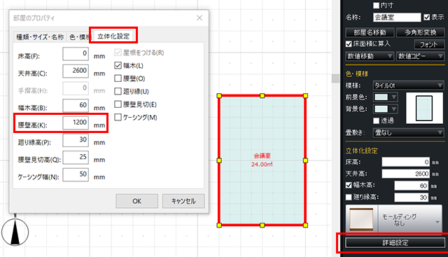 をクリックし、[部屋のプロパティ]の[立体化設定]タブを選択して設定します。