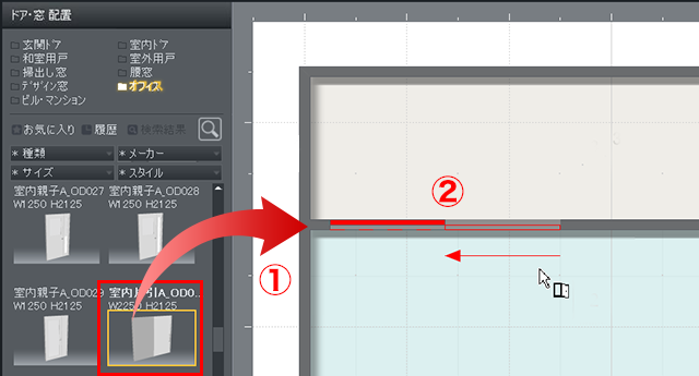 を選択し、壁の上にドアを配置します。配置後、開閉方向をマウスで指定します。