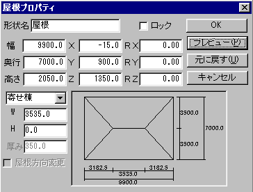 「プレビュー」ボタンを押して、「正面図」で確認してみます。先に作った切り妻屋根の右側の斜面と同じ角度になるように調整します。 微妙な値は「W」に数値を直接入力し調整します。 このとき、「H」の値が0のままにしておきます。角度が同じになったら「OK」ボタンを押します。