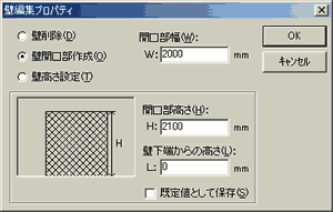 [壁編集プロパティ] ダイアログが表示されますので、「開口部高さ」を設定します。