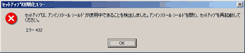 Windows2000でインストール時に「セットアップは、アンインストールシールドが使用中であることを検出しました。アンインストールシールドを閉じ、セットアップを再起動してください。エラー432」と表示されてセットアップができない。