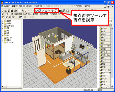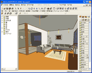 選択したパーツを移動や削除したり、入れ替えたり、また、床や壁のテクスチャを変えたりして室内空間を仕上げていきます。 |